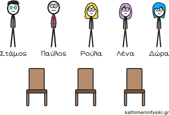 Έστω πως έχουμε 5 ανθρώπους, τον Στάμο, τον Παύλο, τη Ρούλα, τη Λένα, τη Δώρα και 3ς καρέκλες.