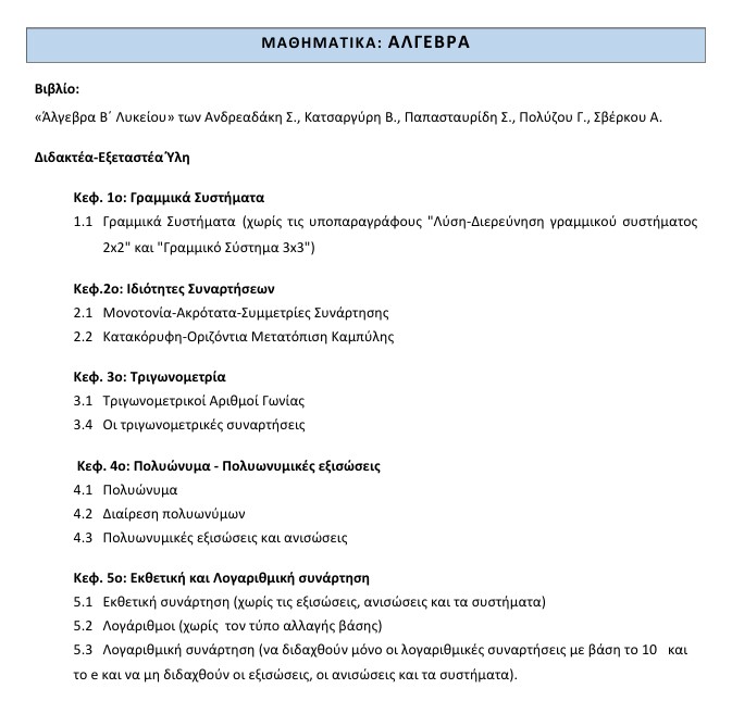 Διδακτέα ύλη Άλγεβρας Β’ Τάξης ΕΠΑΛ – σχολικό έτος 2024 – 2025